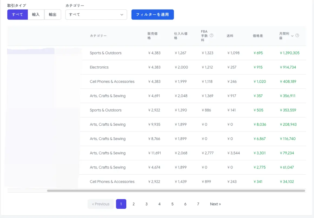 利用者は取引タイプ(輸入・輸出)や商品カテゴリを指定することで、FBA(フルフィルメント by Amazon)手数料や送料、為替レートを考慮したうえで利益が見込める商品を簡単に検索できる。表示画面では販売価格・仕入れ価格のほか、商品サイズや発送コストの詳細も確認可能。収益性の高い商品を優先して表示するなど、直感的なUIも備えている。
