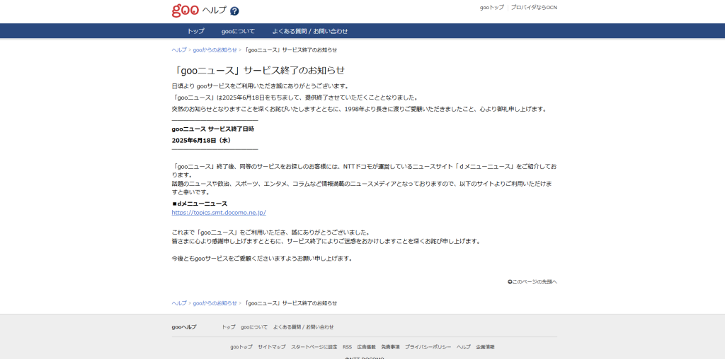 運営元のNTTレゾナントは公式発表で、「突然のお知らせとなりましたことを深くお詫び申し上げるとともに、長年にわたりご愛顧いただいた皆様に心より御礼申し上げます」と感謝の意を表明。今後はNTTドコモが提供するニュースサービス「dメニューニュース」への利用を案内している。