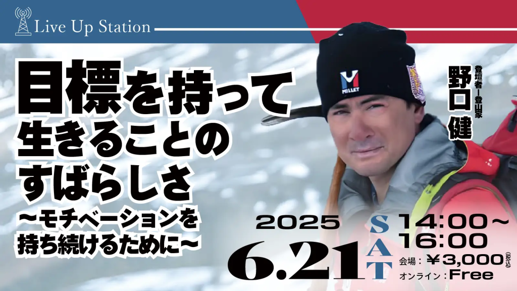 数々の登山や環境保護活動で知られる登山家・野口健氏が、人生の目標やモチベーションの保ち方について語る特別セミナーが、6月21日(土)に東京都新宿区とオンラインのハイブリッド形式で開催される。主催は、資産形成やライフデザインの支援を行う株式会社クレア・ライフ・パートナーズ(本社・東京都新宿区、代表取締役社長:工藤将太郎)で、同社が運営する人生の学びの場「Live Up Station」の第4回企画として実施される。