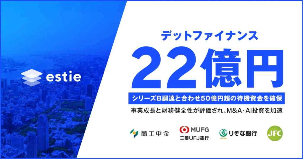 商業用不動産データ分析サービスを手掛ける 株式会社estie(東京・港区) は17日、商工組合中央金庫や三菱UFJ銀行など4金融機関と総額22億円の融資契約を締結したと発表した。タームローンと長期コミットメントラインを組み合わせたデットファイナンスで、シリーズBラウンドでのエクイティ調達と合わせた手元資金は 50億円超 に達したという。