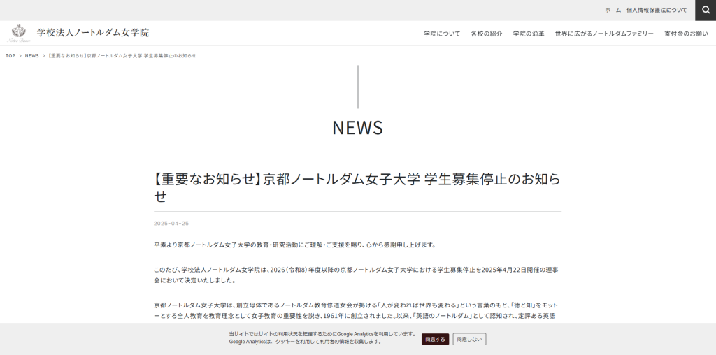 学校法人ノートルダム女学院(京都市)は25日、運営する京都ノートルダム女子大学(京都市左京区)の学生募集を2026年度から停止すると発表した。学生募集の停止は2025年4月22日に開催された同学院理事会で決定されたもので、近年の急速な少子化に伴う18歳人口の激減など厳しい社会情勢を背景に、「苦渋の決断を余儀なくされた」(和田環理事長)という。