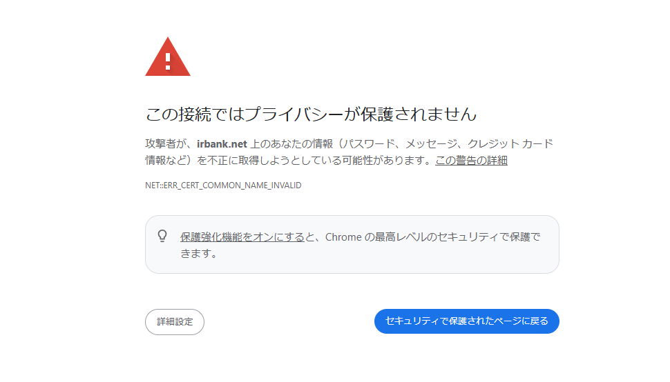 Google Chromeなど主要ブラウザで「https://irbank.net」にアクセスすると、「この接続ではプライバシーが保護されません」という警告文と共に、SSL証明書のドメイン不一致を示す「NET::ERR_CERT_COMMON_NAME_INVALID」エラーが表示され、正常な閲覧が不可能な状態となっている。