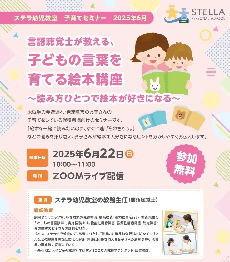 発達障害や言語発達の遅れに不安を抱える保護者らを対象に、専門家が家庭での支援法を伝授するオンラインセミナーが来月22日に開催される。主催するのは、児童発達支援を行う「ステラ幼児教室」(運営:株式会社GUTS、名古屋市)。言語聴覚士の資格を持つ教務主任が講師を務め、絵本を活用した言葉の発達支援について解説する。