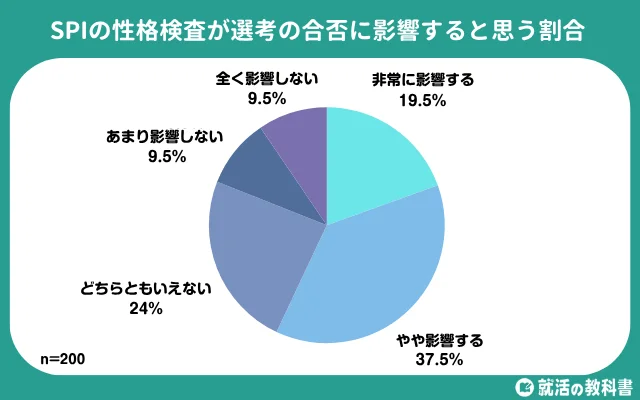 その結果、SPI性格検査が「非常に合否に影響する」(19.5%)、「やや影響する」(37.5%)と答えた学生は57.0%にのぼり、過半数が性格検査を「選考に影響する要素」として認識していることがわかった。