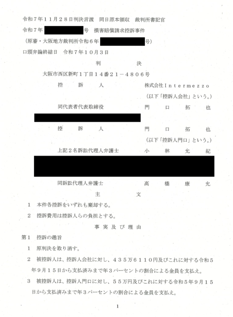 大阪高裁は、株式会社Intermezzoおよび同社代表取締役の門口拓也氏が、X(旧Twitter)上の投稿によって名誉を毀損されたとして損害賠償を求めた控訴審で、原告側の請求を棄却した。第一審の大阪地裁に続き、二審でも原告側敗訴の判断が維持された。