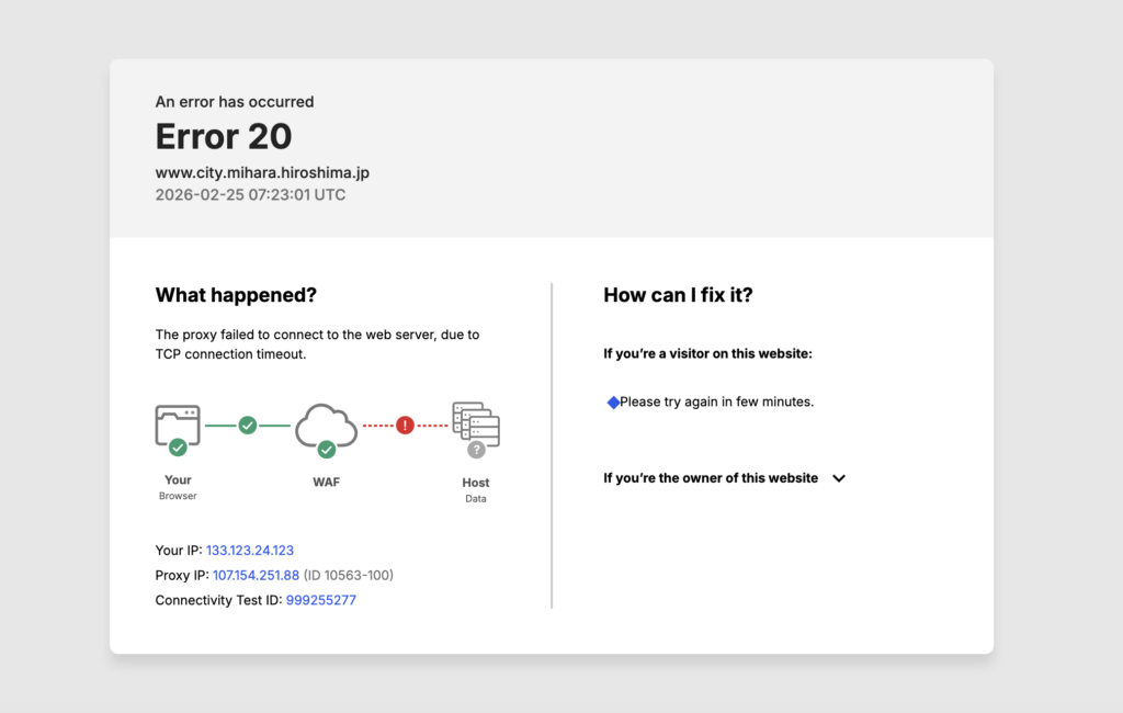 上記は、広島県三原市の公式ウェブサイト( www.city.mihara.hiroshima.jp )にアクセスした際に表示されたエラー画面である。