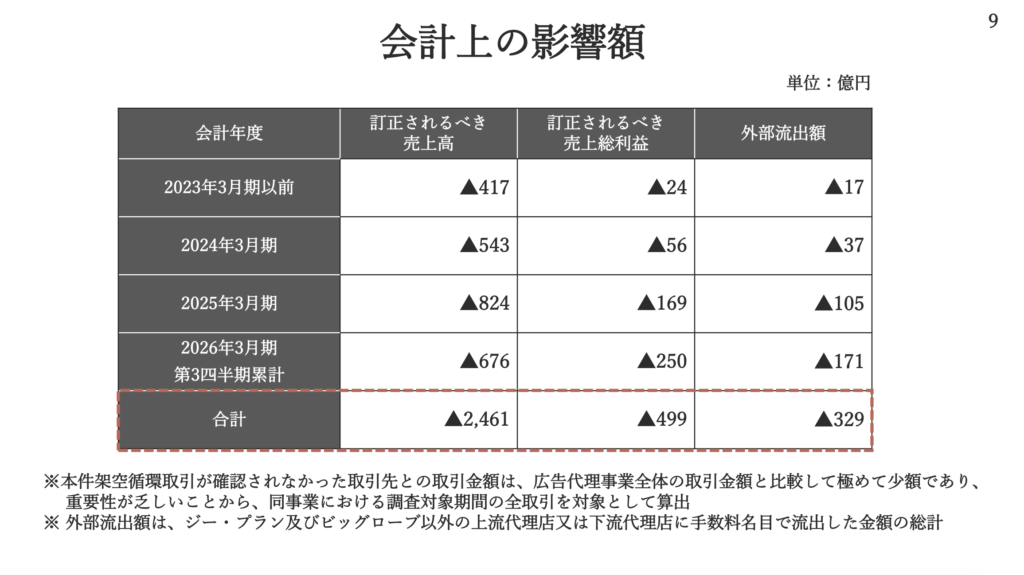 影響額も極めて大きい。売上高の訂正額は累計で約2,461億円、営業利益の訂正額は499億円、さらに外部流出額は329億円に達した。